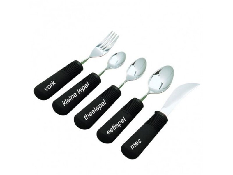 Good Grips Besteck hat weiche und gepolsterte Handgriffe, die bieten auch gute Nasshaftung. Die komfortablen Griffe sind bis zu 3,5 cm dick und aus einem weichen gummiartigen Material mit flexiblen Riffelung, die auf jeder Hand anzupassen gemacht. Die Form ist rund und konisch. Alle haben rostfreie Metallteile in der Welle an einem Wendepunkt, so dass der Löffel in einem beliebigen Winkel gebogen werden kann, links und rechts. Diese Version ist extra schwer gegen Tremor. Jeder Rahmen wiegt ± 170 g. Spülmaschinenfest.