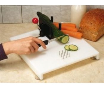 Les bords relevés garantissent contrôle et stabilité lorsque, par exemple, des légumes finement hachés sont versés sur la casserole ou dans un bol. La surface de coupe a une légère pente vers le